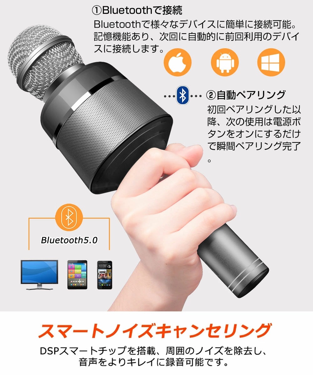 セット内容 Bluetoothカラオケマイク×1、専門ケース×1、USB充電ケーブル×1本、3.5mmポーチのオーディオケーブル×1本、スポンジカバー付き×1本、日本語簡易取扱説明書×1