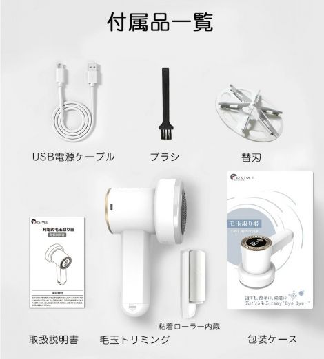 セット内容 毛玉取り器*1(粘着式クリーナー内蔵)替え刃*1掃除用ブラシ*1USB充電ケーブル*1パッケージ*1